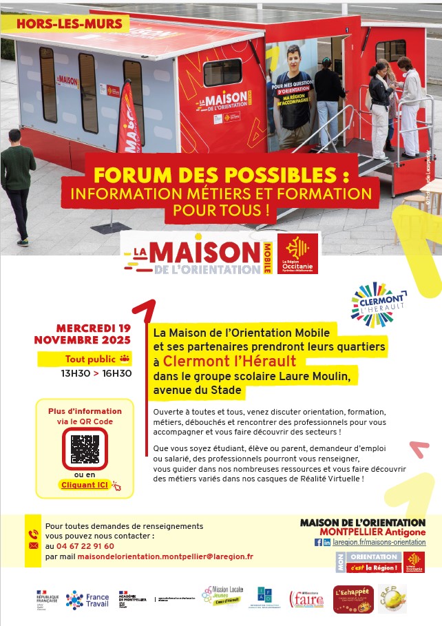 La Maison de l’Orientation Mobile et ses partenaires prendront leurs quartiers à Clermont-l’Hérault dans le groupe scolaire Laure Moulin, avenue du Stade ! Que vous soyez étudiant, élève ou parent, demandeur d’emploi ou salarié, des professionnels pourront vous renseigner, vous guider dans nos nombreuses ressources et vous faire découvrir des métiers variés dans nos casques de Réalité Virtuelle !